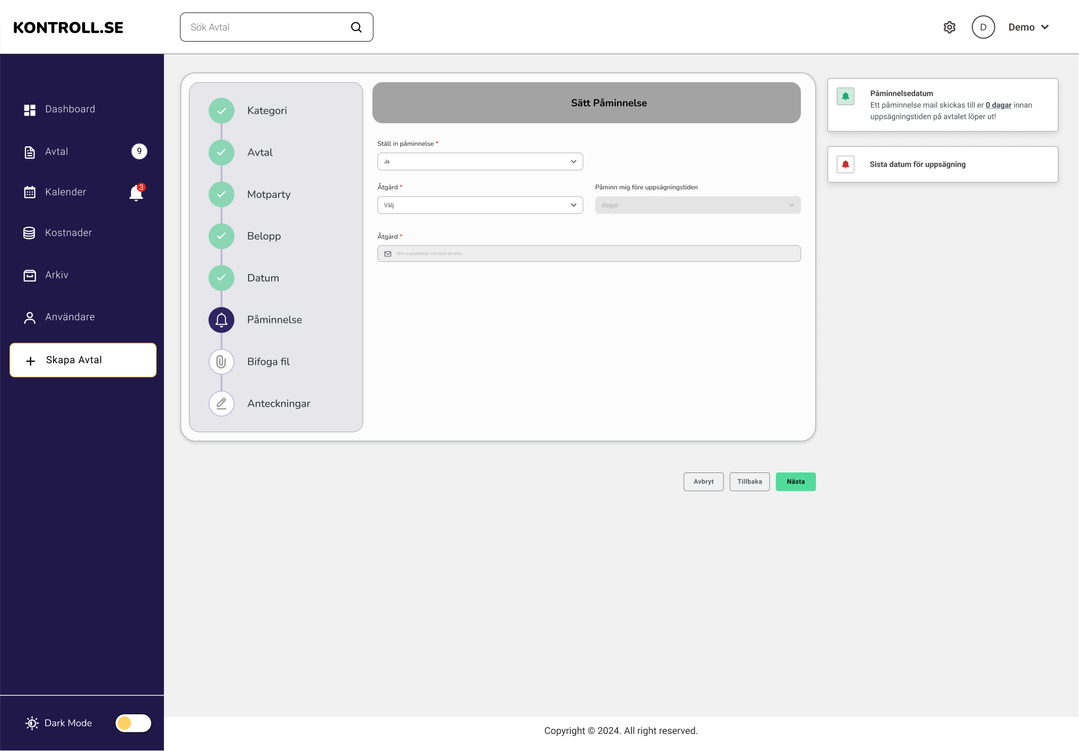 När du har lagt tiill ett avtal så kan du enkelt ställa in påminnelser när du t. ex. vill säga upp avtalet, utvärdera eller när avtalet ska förnyas.
